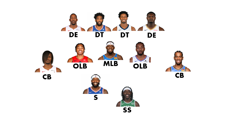 DL: Bam Adebayo, Joel Embiid, Jaren Jackson Jr, Zion Williamson – Moving onto the defensive side of the ball, we’ll start with this elite defensive line. Good luck to any opposing QB’s that don’t get the ball out of the pocket within 0.5 seconds becuse these giants will wreck havvock in an instant. Zion and Bam rushing off the edge are the perfect combination, Zion will bull rush any offensive lineman with his 800 pound self and Bam will use his combined strength with fantastic skill and footwork to get around anyone. I see Embiid serving this line as an Aaron Donald-type guy for the squad as he is stronger than everyone else and will use every bit of it to his advantage. Jaren Jackson Jr also a servicable defender as well with a large frame.