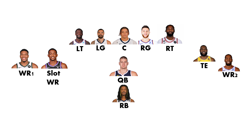 OL: Julius Randle, Steven Adams, Kenneth Lofton Jr, Jusuf Nurkic, Andre Drummond – Don’t need the player-by-player run down here but all mainly possess the same traits. Some big body boys. Nothing specific in terms of style of play that made me think these guys would best suit the offensive line other than I just imagine they would be good. I would trust Steven Adams with my life to protect me from rushing defenders. Also Ken Lofton is just a humungous human and close to the ground so good luck defending the Philly Special tush push when LeBron James is running into his giant back to gain a yard or 2 every single time.