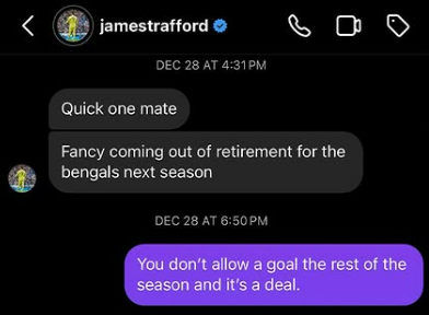 JJ, being the wonderful man he is, didn’t give James a straight up “no” and instead told the goalie he would take Tafford up on his offer under one condition. JJ Watt agreed to join the Bengals in a return to the NFL IF James Tafford could go the remainder of the season without giving up a singular goal.
